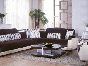 The fabric is polyester and has a crackled look adding texture to the style. the monochromatic pillows that are included balance the simplicity of the convertible sofa. The Click-Clack conversion mechanism makes it super easy to go from sitting to sleeping for guests or late nights. It is easy enough for young and old alike to operate making it a great choice for families. The seating is composed of innerspring over high-density foam making it not only comfortable but long-lasting.