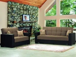 The Roxy with wood top decorative arms is as modern in style as it is in function. The Full Sofa opens to a true full at 53"x75" accommodating two adults with ease. All accent pillows are included completing the look for style and comfort. Each piece in the set has built-in under seat storage with ample space for storing bedding or other items. Its easy Click-Clack mechanism makes it easy for young and old to operate. Whether you're in need of a sofa sleeper or a whole set the Roxy can accommodate any need.